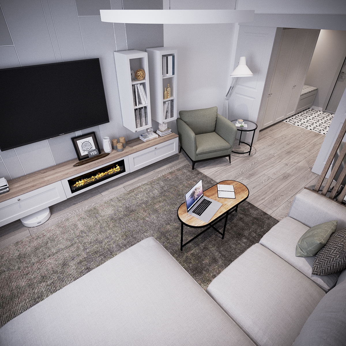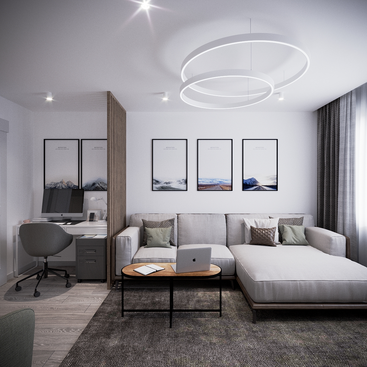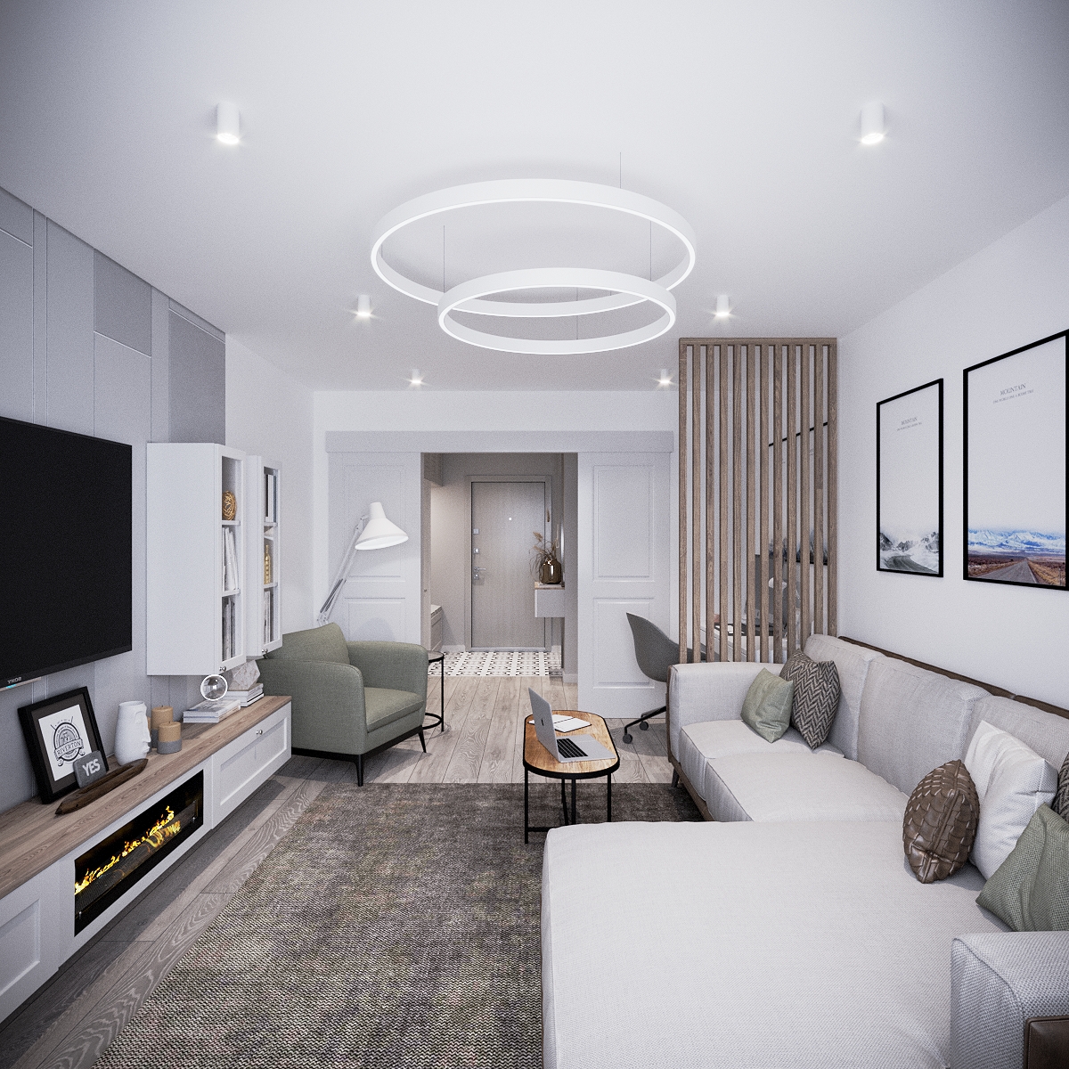 A modern apartment where simplicity becomes elegance. Neutral colors and clean forms shape the living areas, while carefully chosen lighting adds sophistication. Every element is designed to maximize comfort and style in a compact layout.