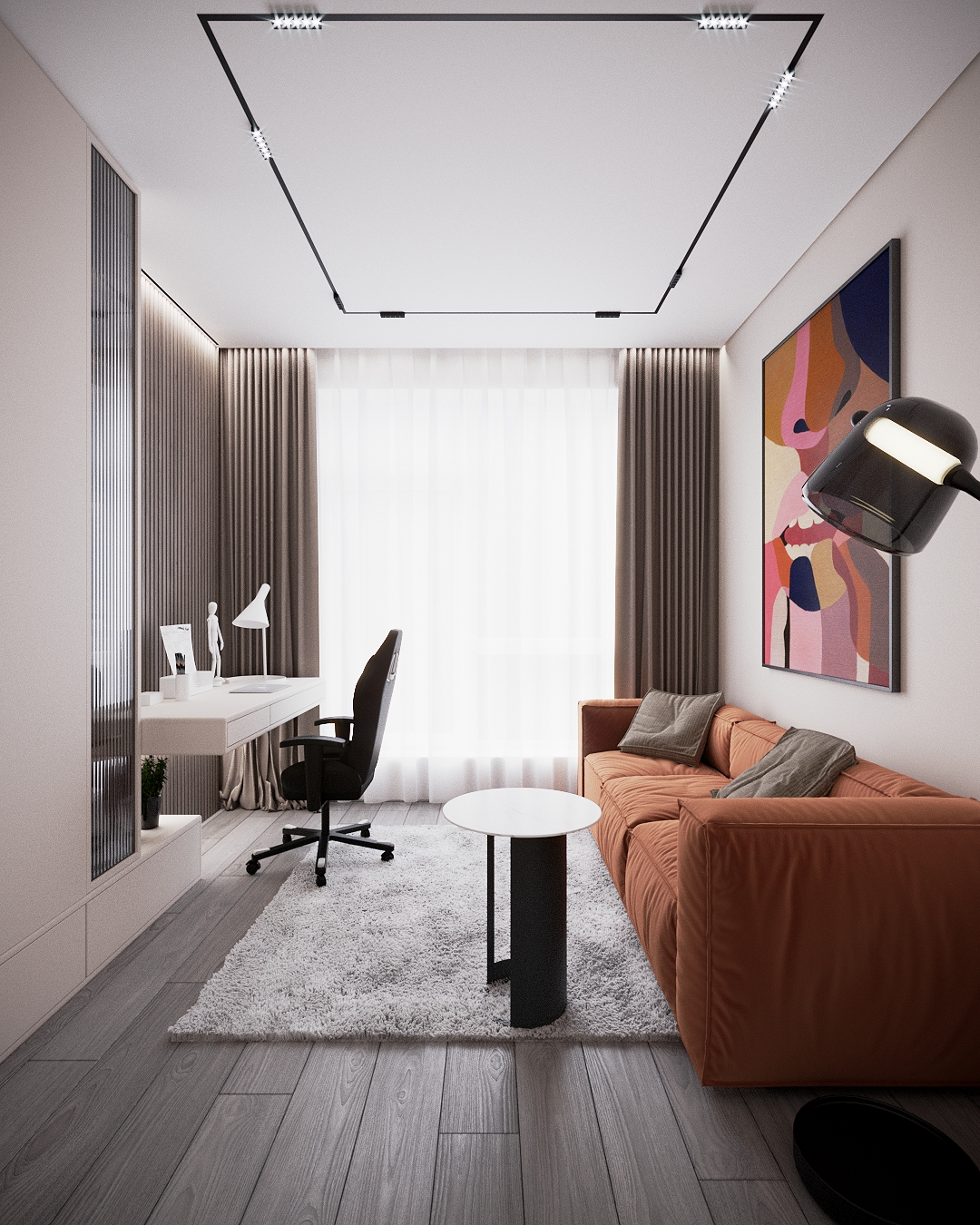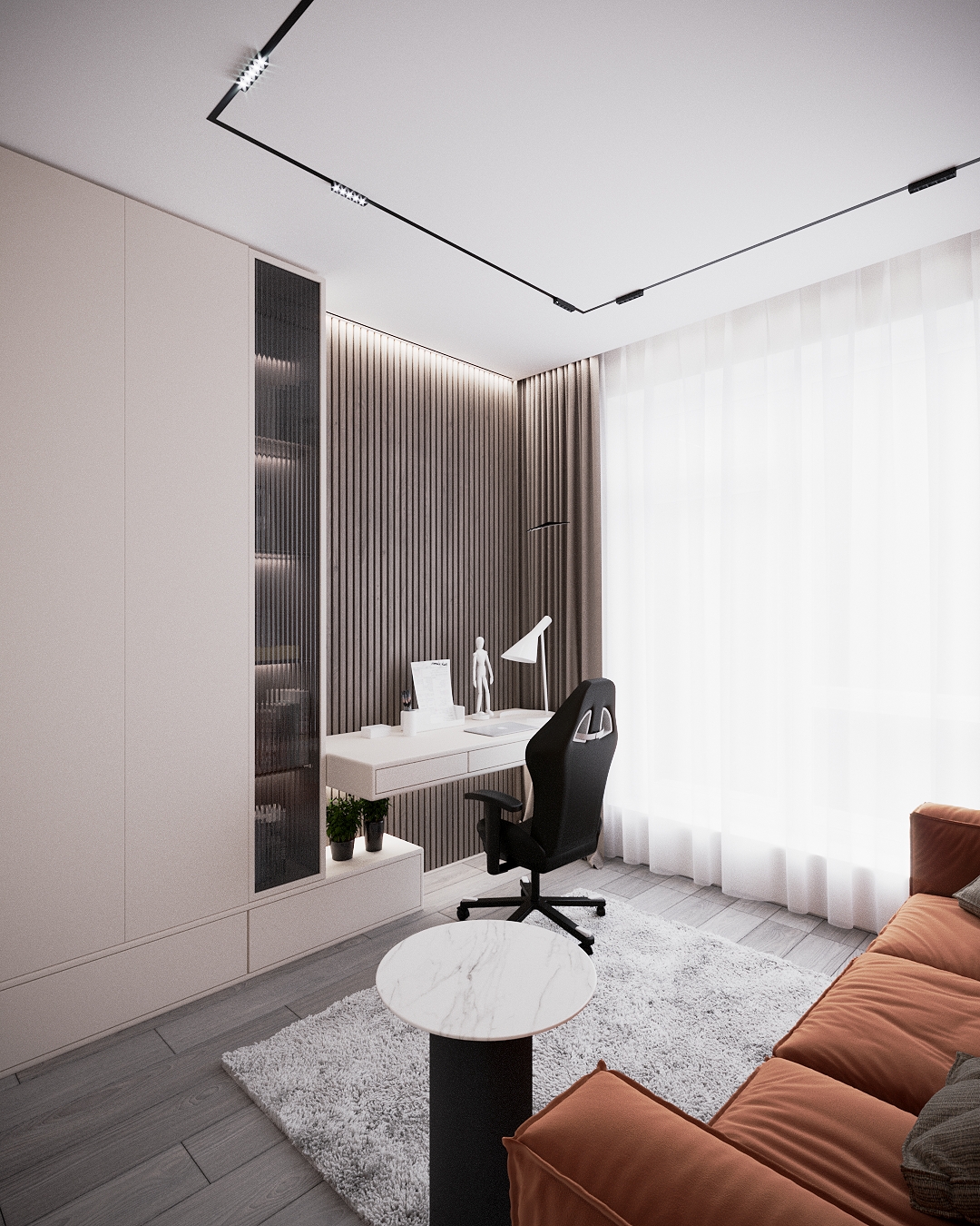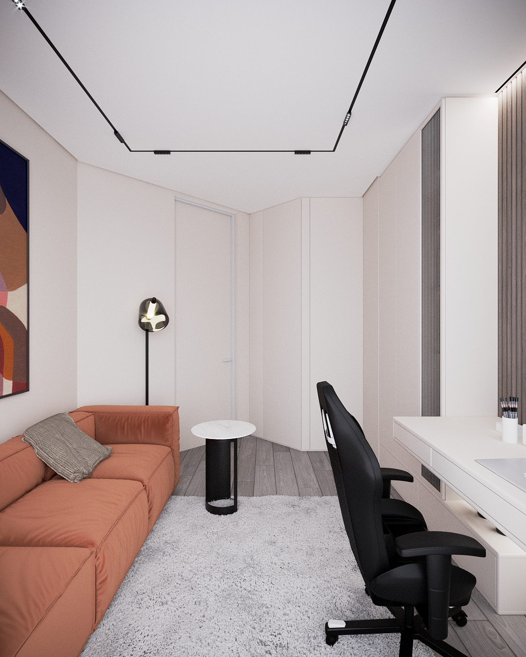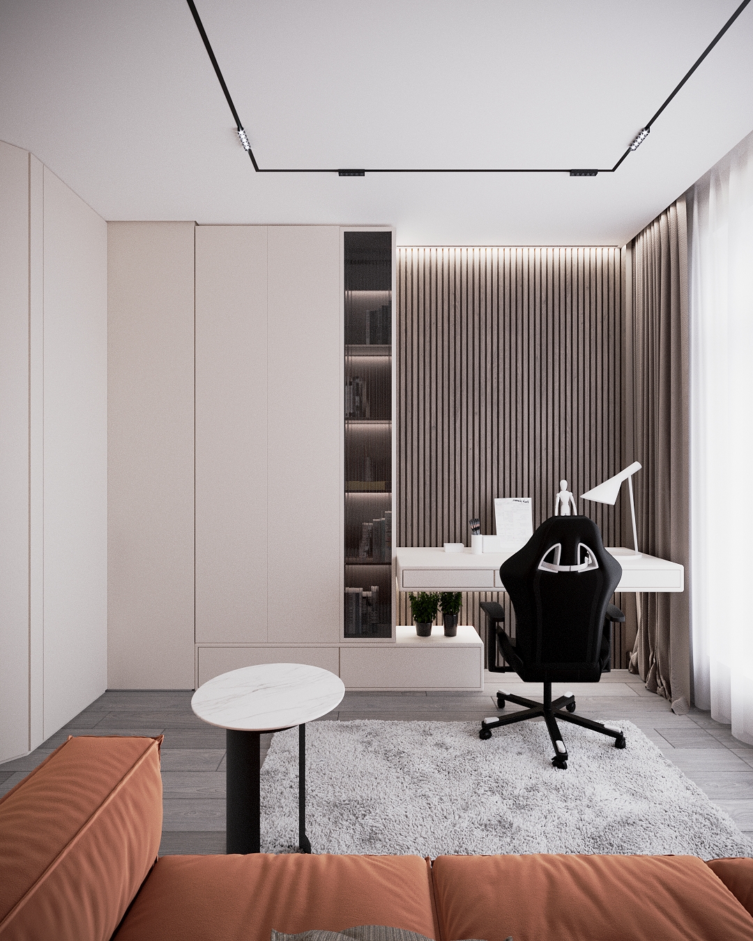 A modern apartment on the upper floor of a residential tower, designed for a young couple. The bedroom and living area showcase a palette of neutral beige tones, while the home office adds energy with vibrant orange accents. A spacious walk-in closet also houses the laundry zone, maximizing functionality without sacrificing style.