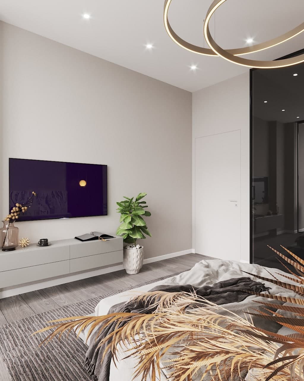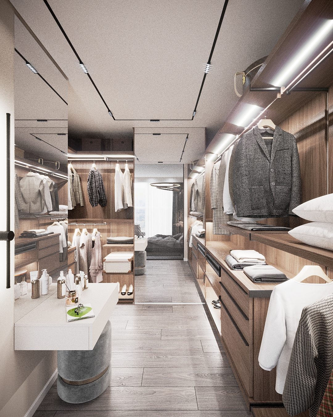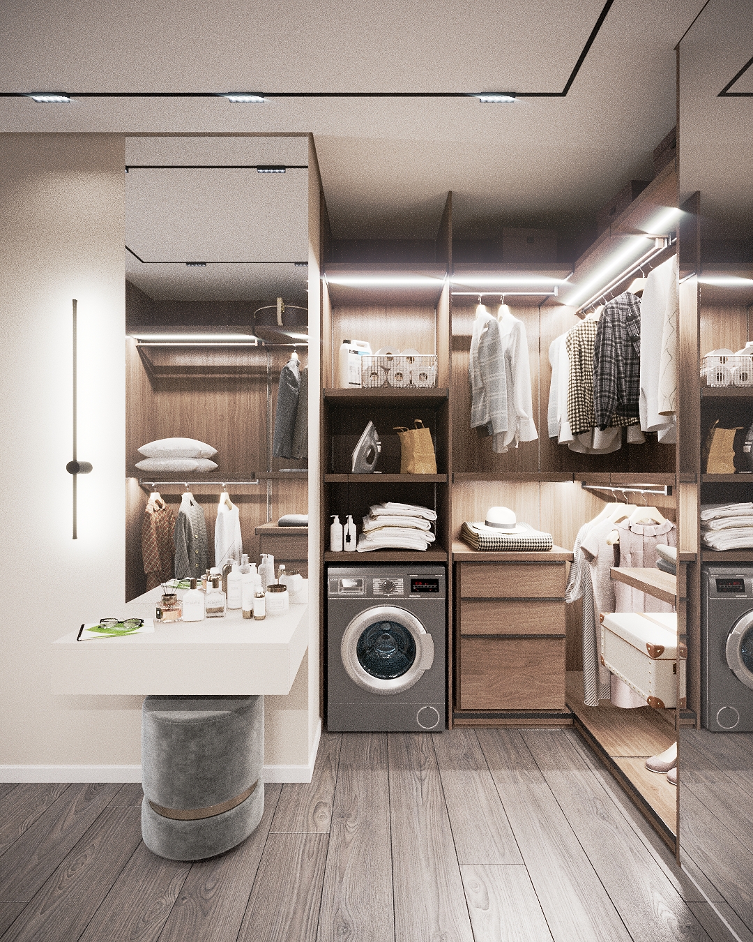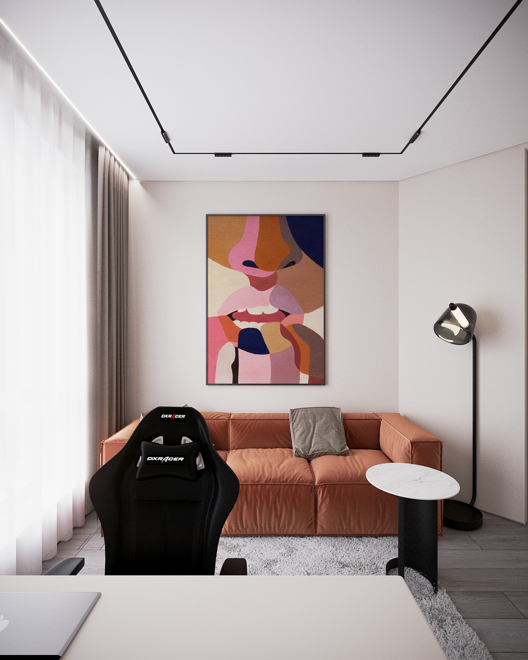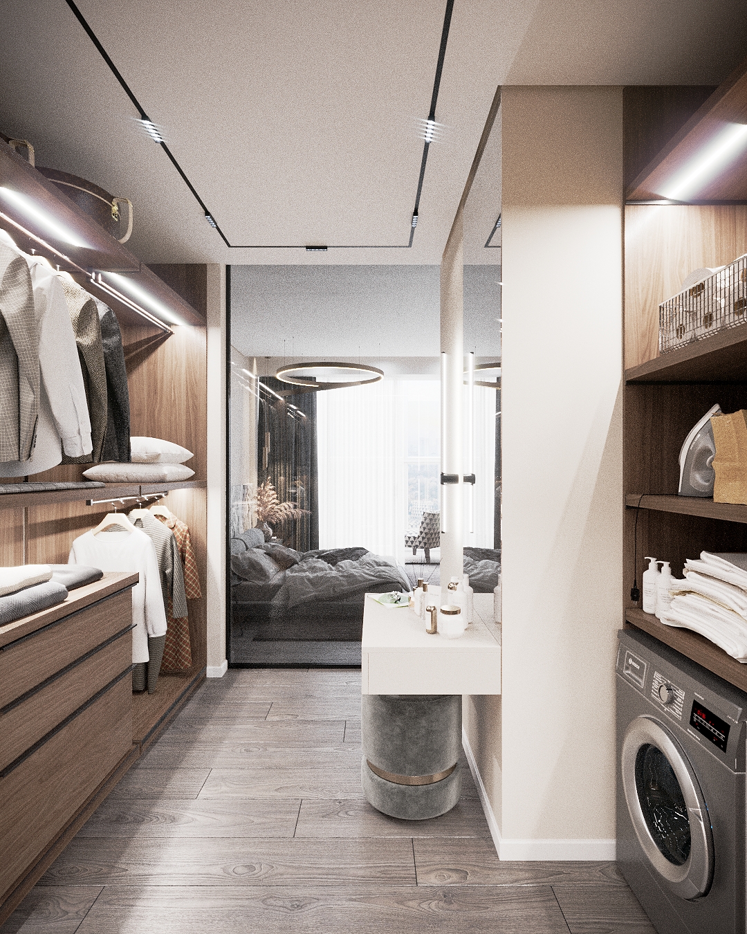 A modern apartment on the upper floor of a residential tower, designed for a young couple. The bedroom and living area showcase a palette of neutral beige tones, while the home office adds energy with vibrant orange accents. A spacious walk-in closet also houses the laundry zone, maximizing functionality without sacrificing style.
