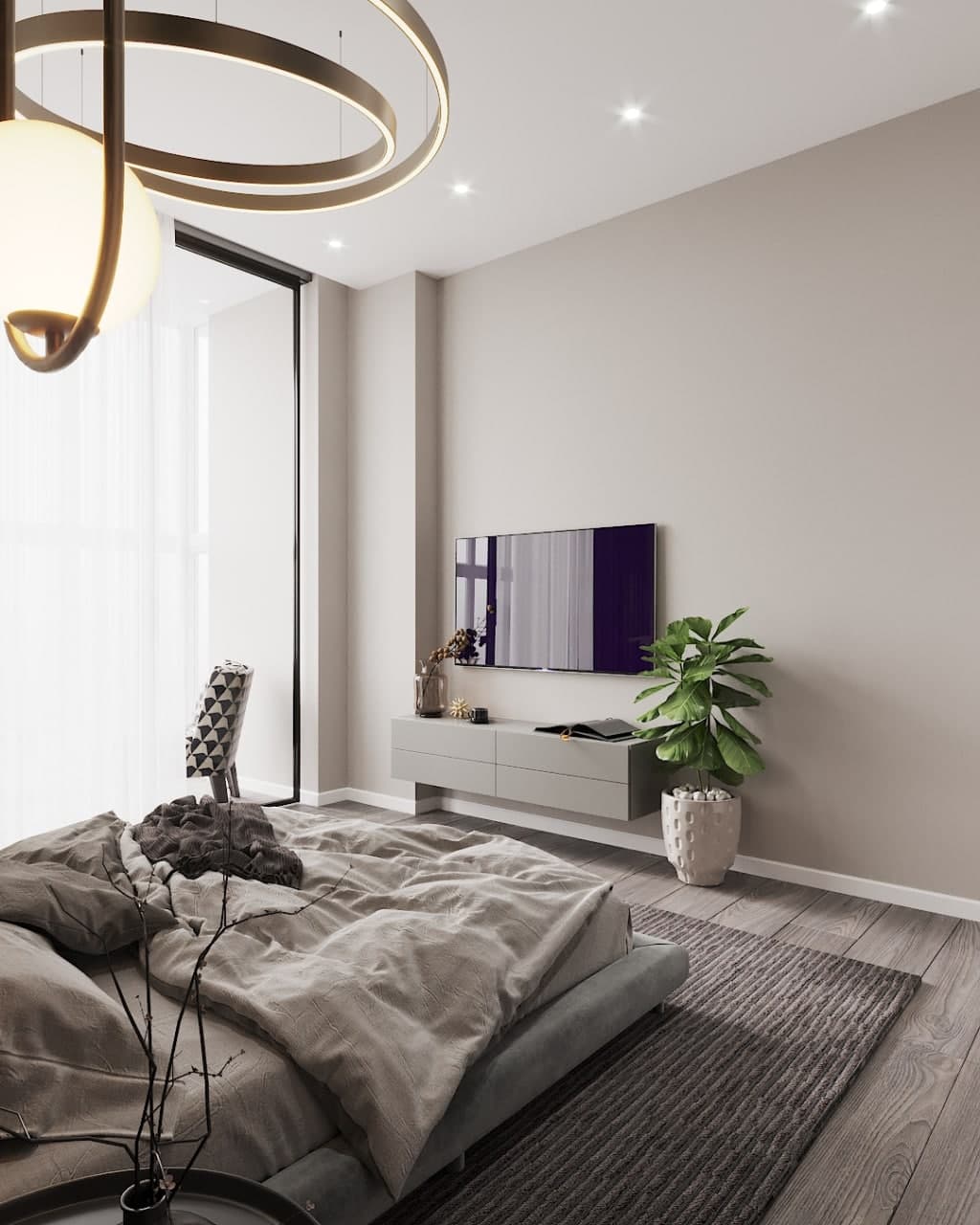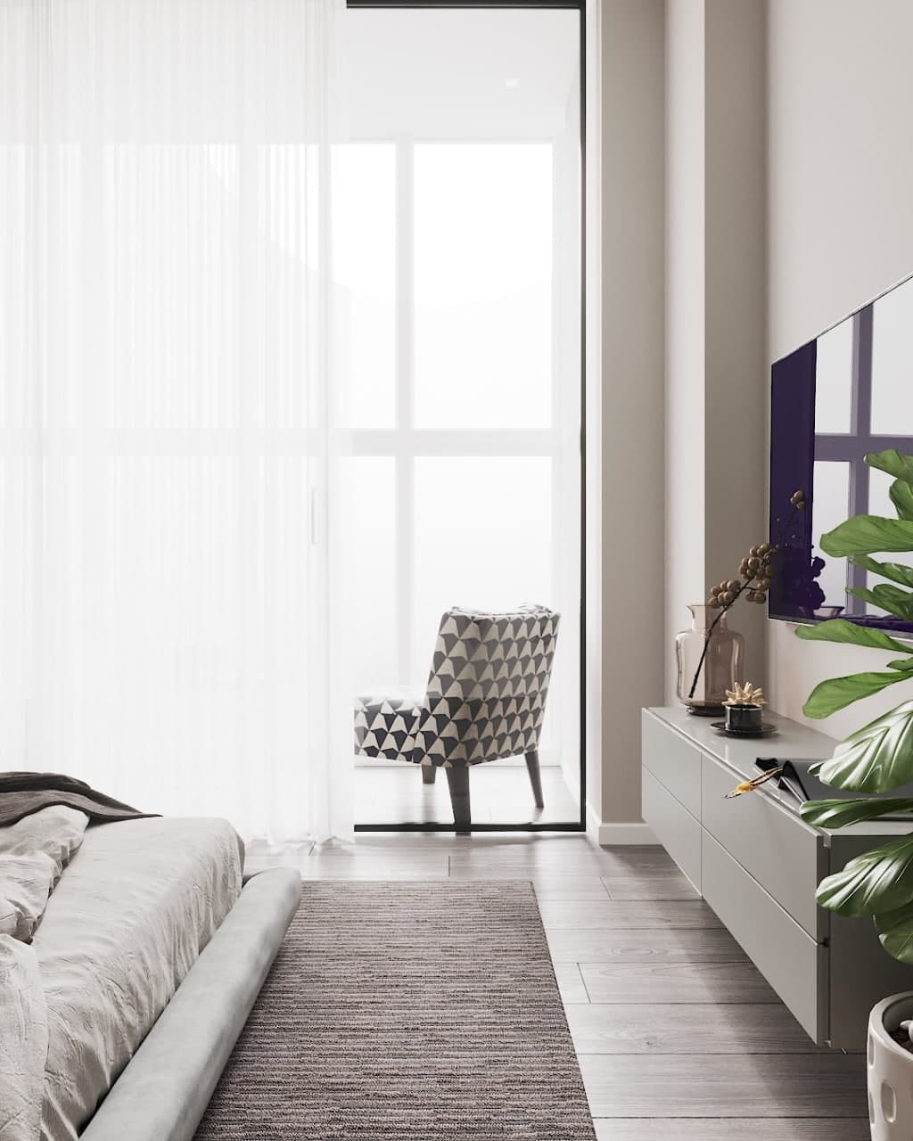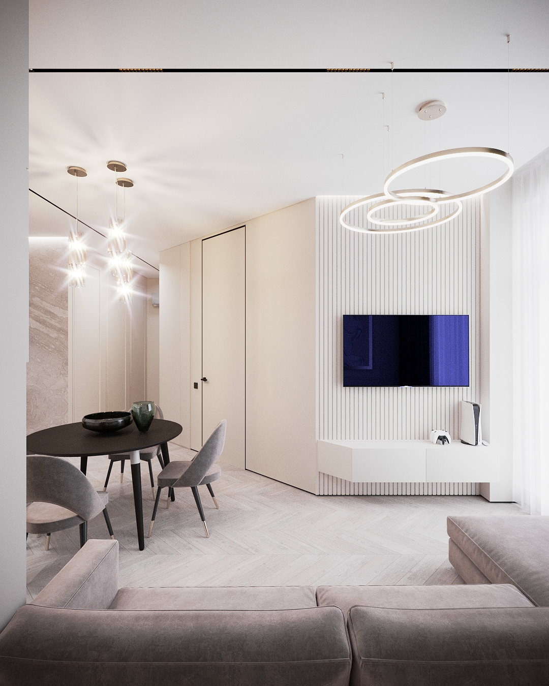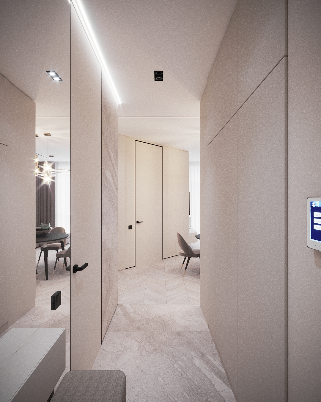 A modern apartment on the upper floor of a residential tower, designed for a young couple. The bedroom and living area showcase a palette of neutral beige tones, while the home office adds energy with vibrant orange accents. A spacious walk-in closet also houses the laundry zone, maximizing functionality without sacrificing style.