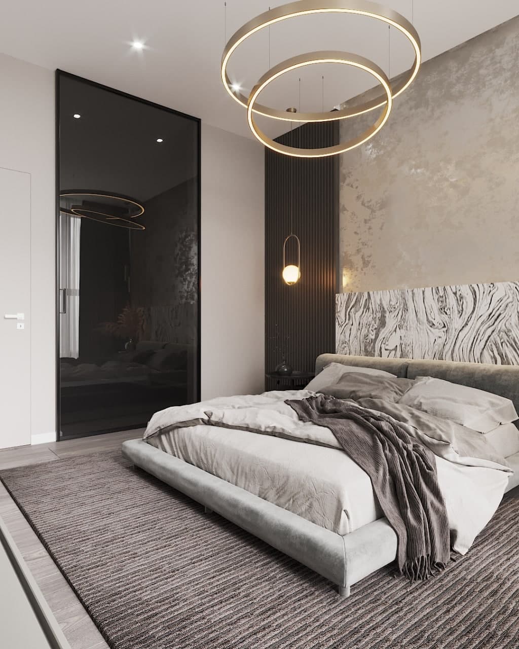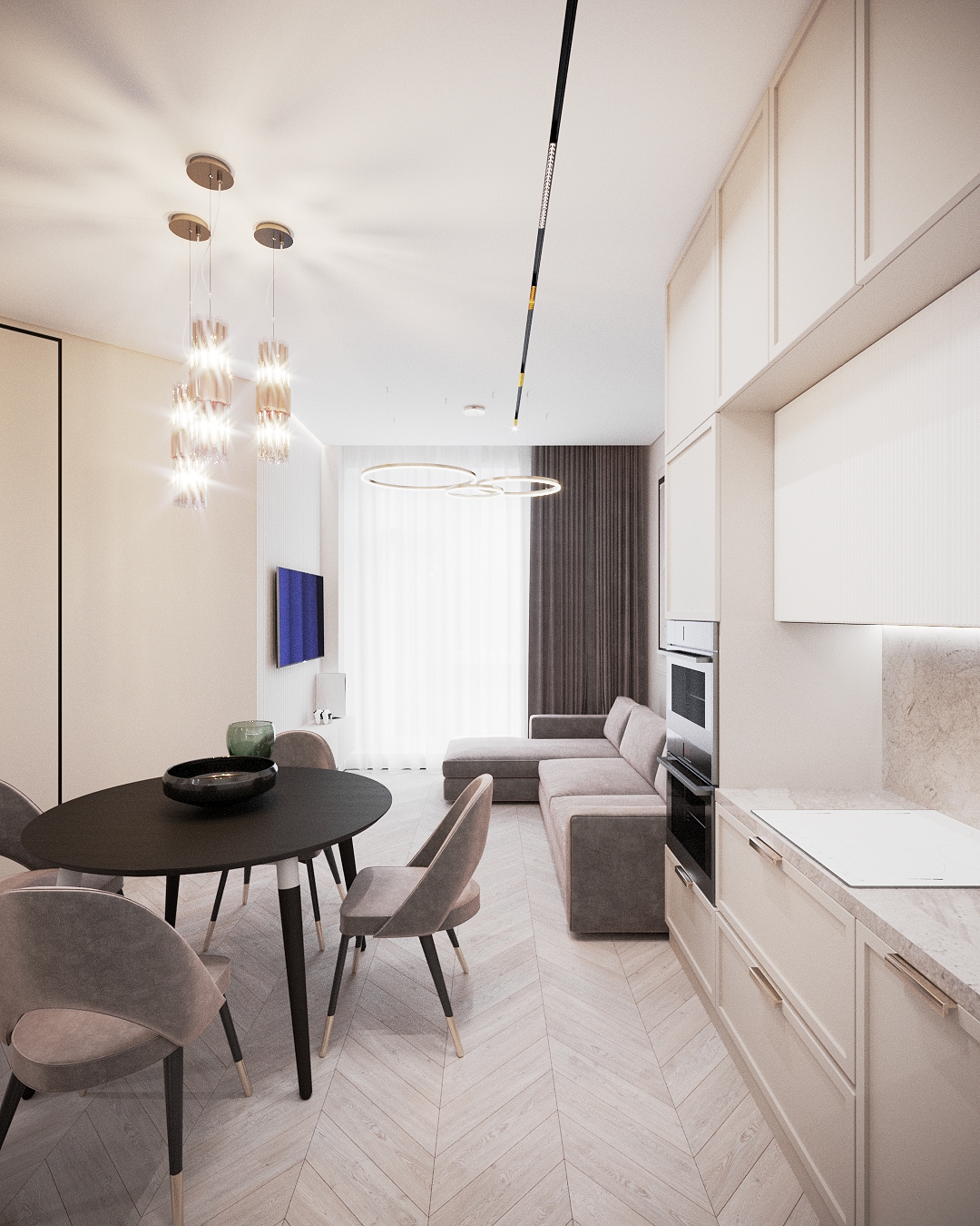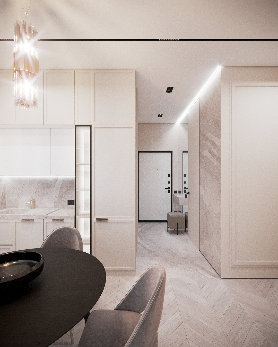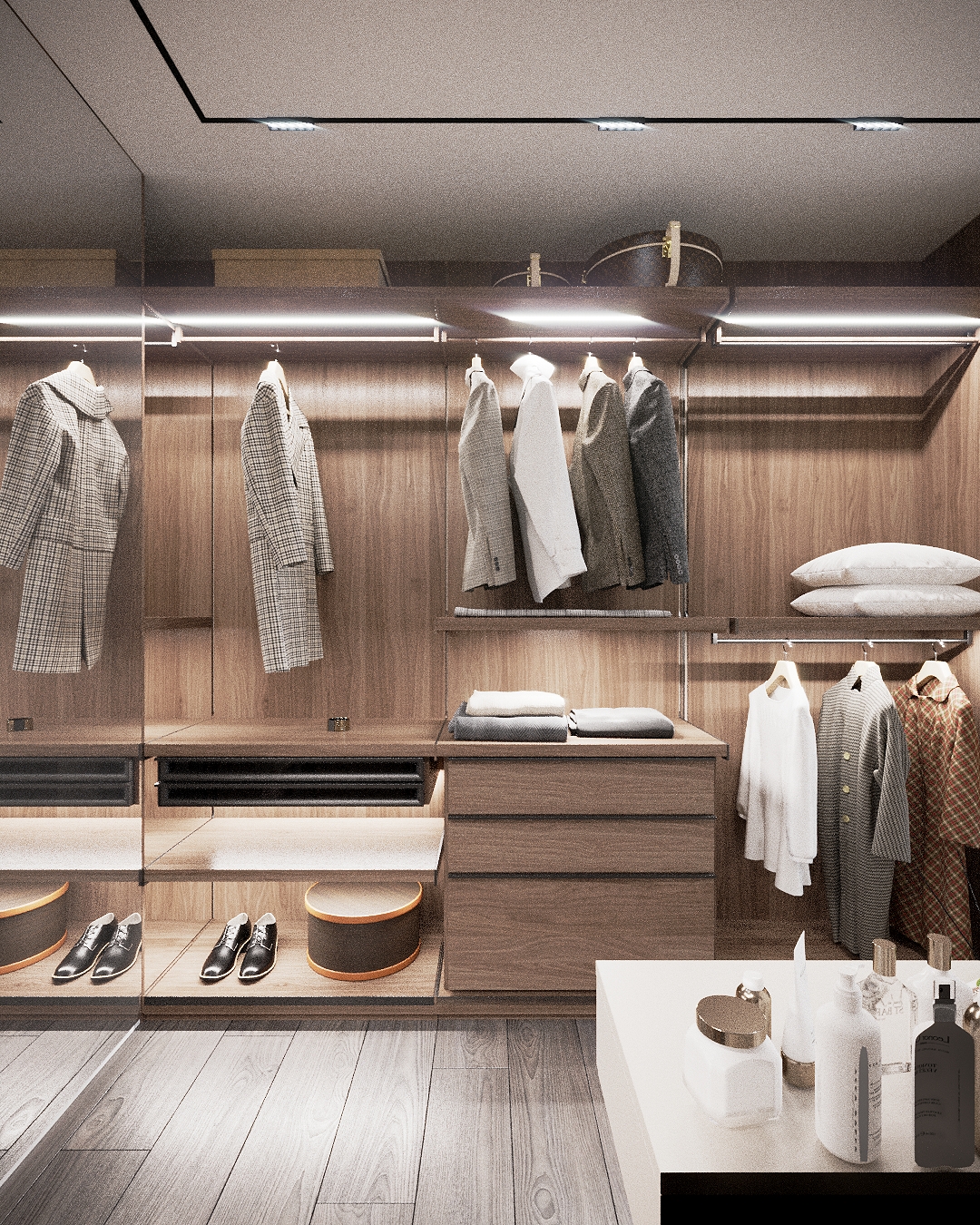 A modern apartment on the upper floor of a residential tower, designed for a young couple. The bedroom and living area showcase a palette of neutral beige tones, while the home office adds energy with vibrant orange accents. A spacious walk-in closet also houses the laundry zone, maximizing functionality without sacrificing style.