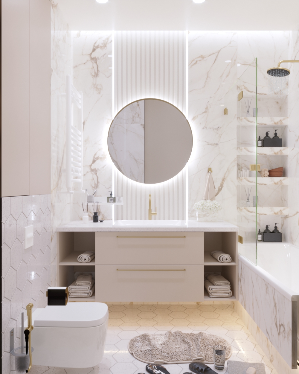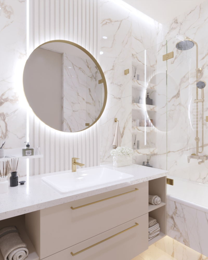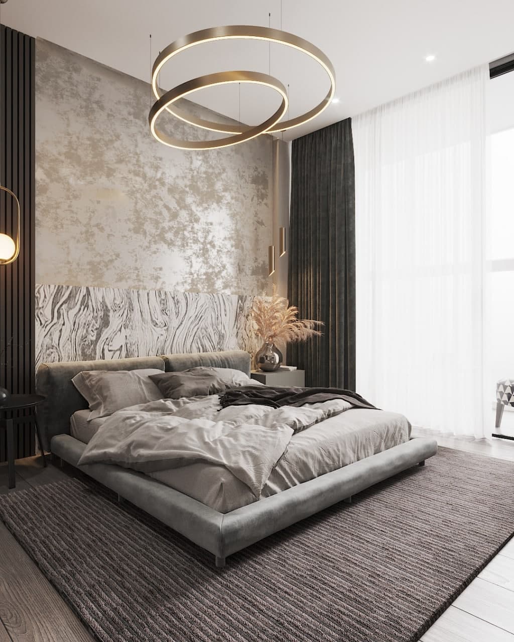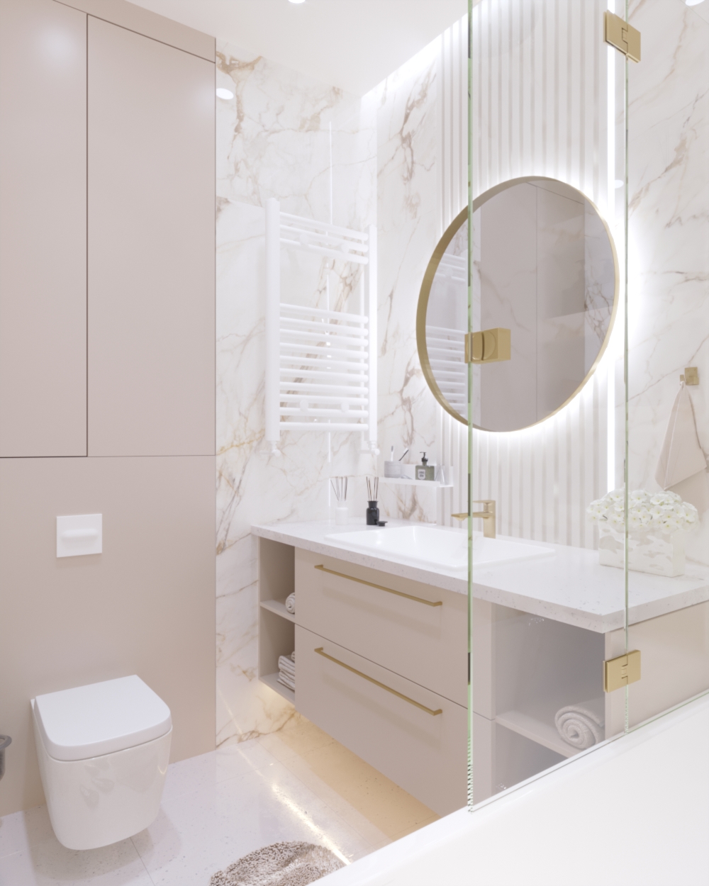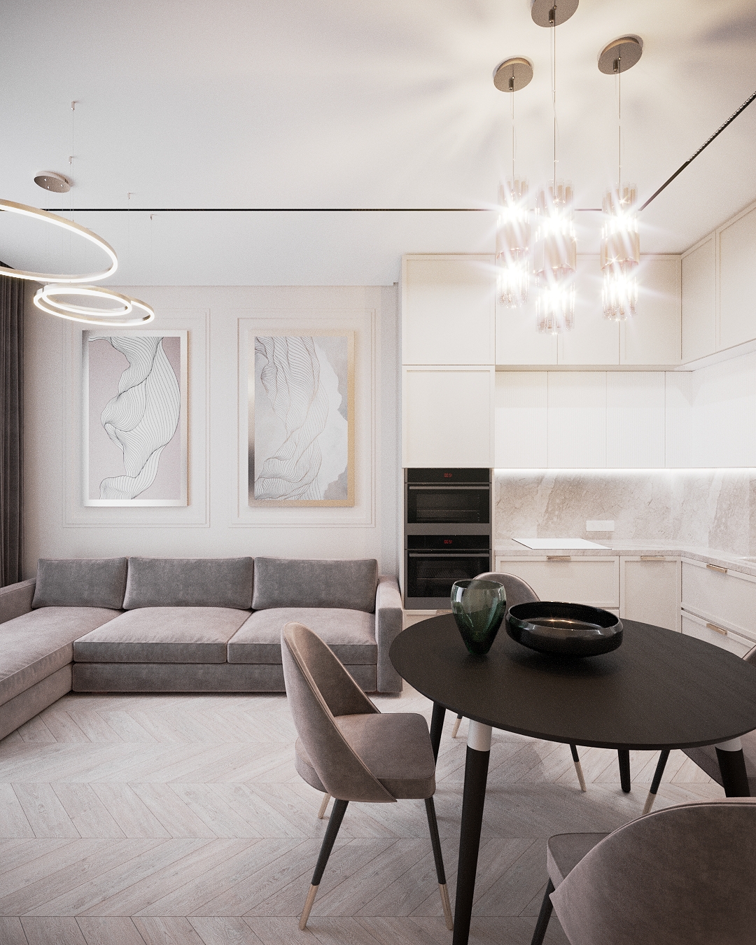 A modern apartment on the upper floor of a residential tower, designed for a young couple. The bedroom and living area showcase a palette of neutral beige tones, while the home office adds energy with vibrant orange accents. A spacious walk-in closet also houses the laundry zone, maximizing functionality without sacrificing style.