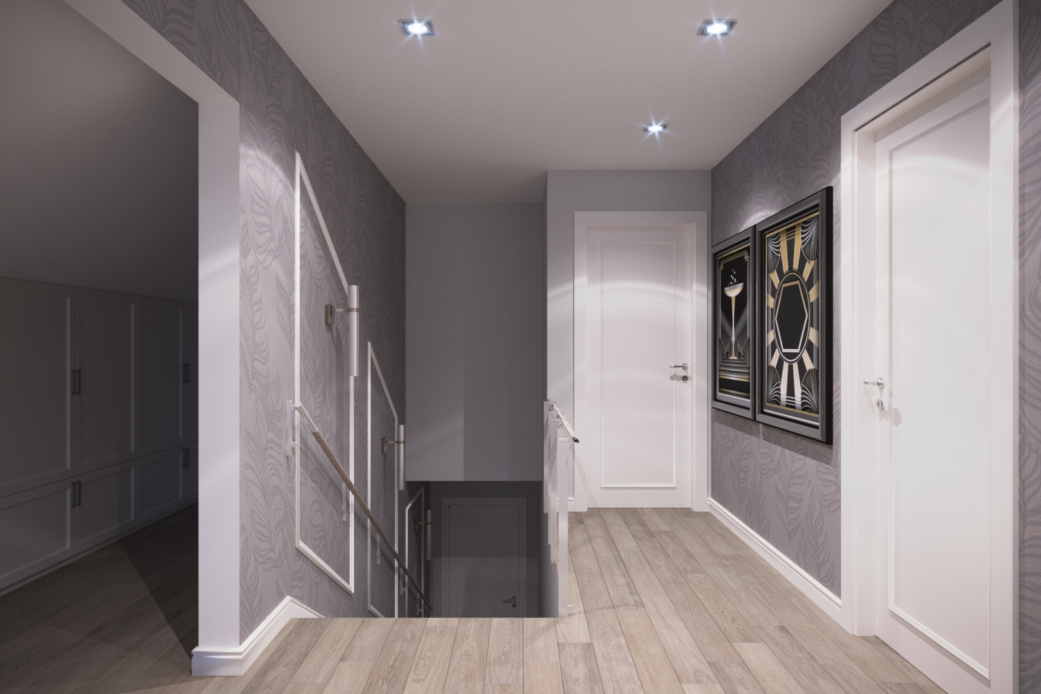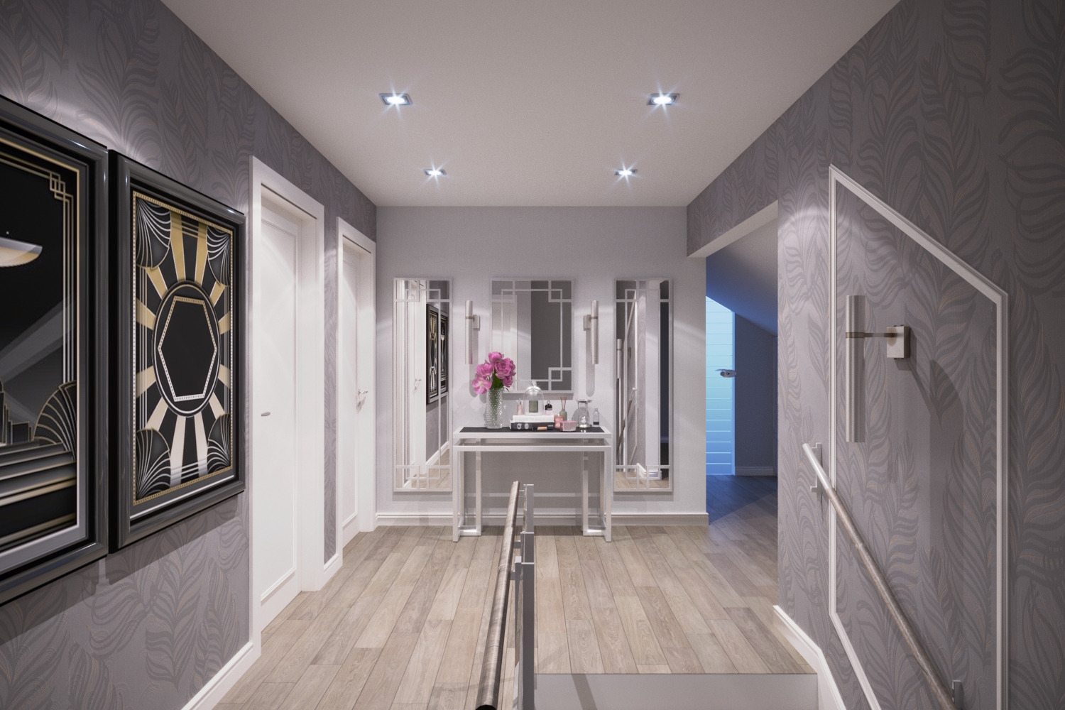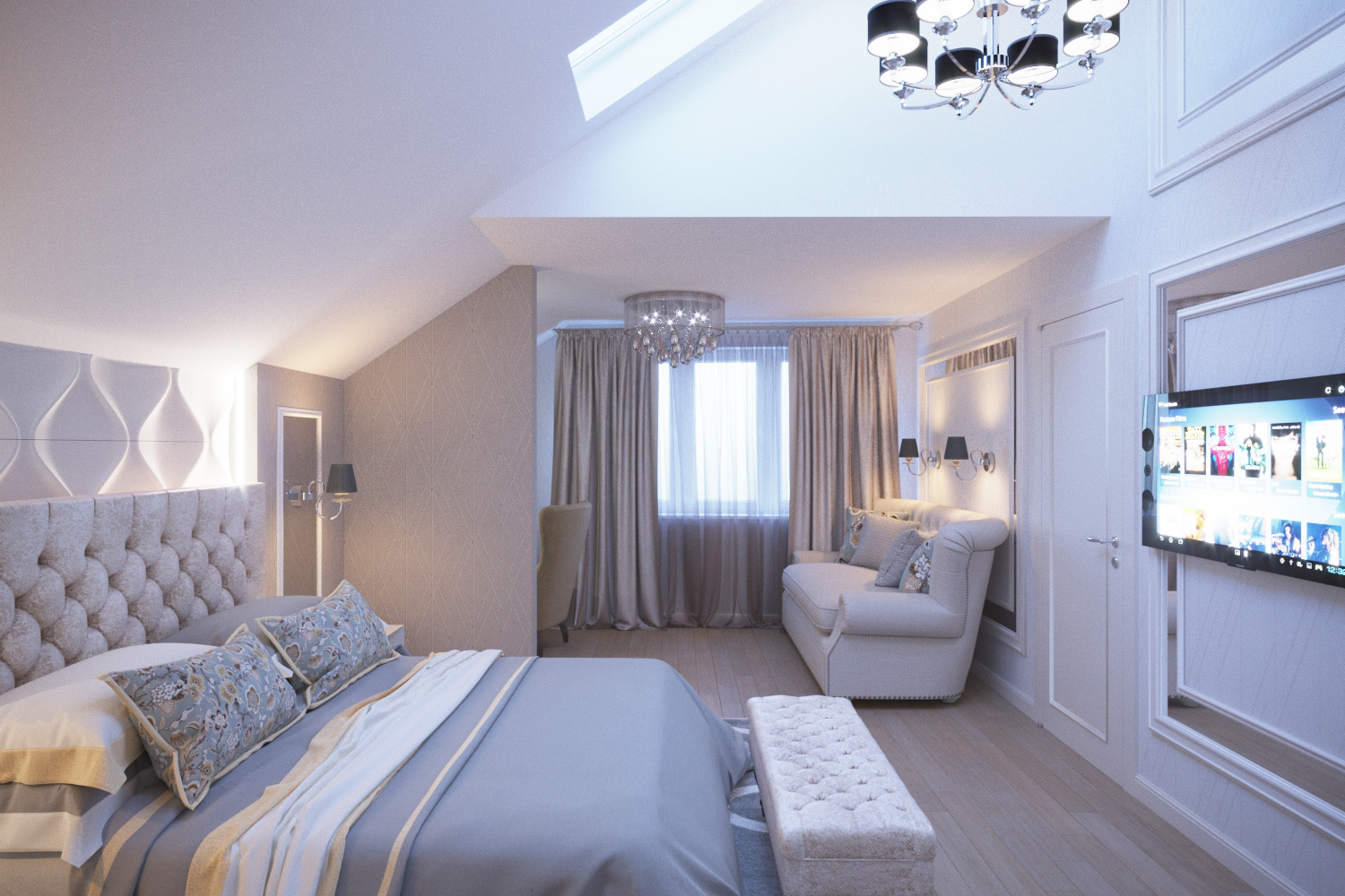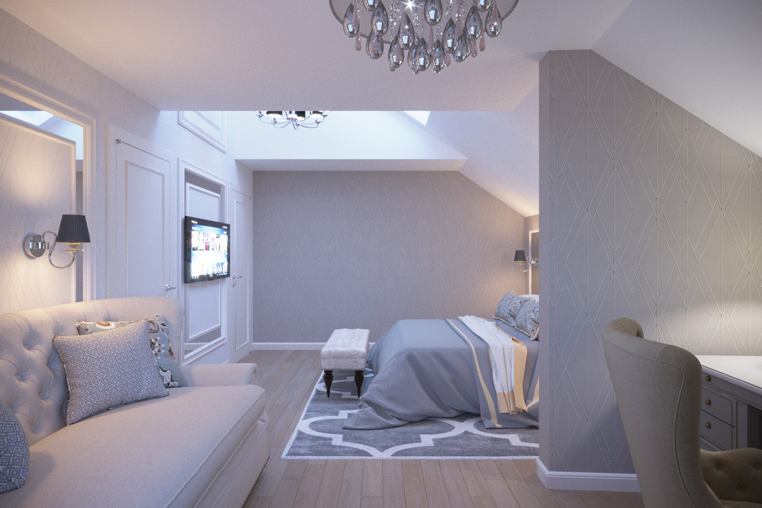 This renovation project gave a private house a new life with a redesigned attic floor. The interior embraces modern classic style with accent wallpapers, ceiling and wall lighting, and a carefully curated decorative palette. The result is a sophisticated and comfortable home that balances tradition and modernity.