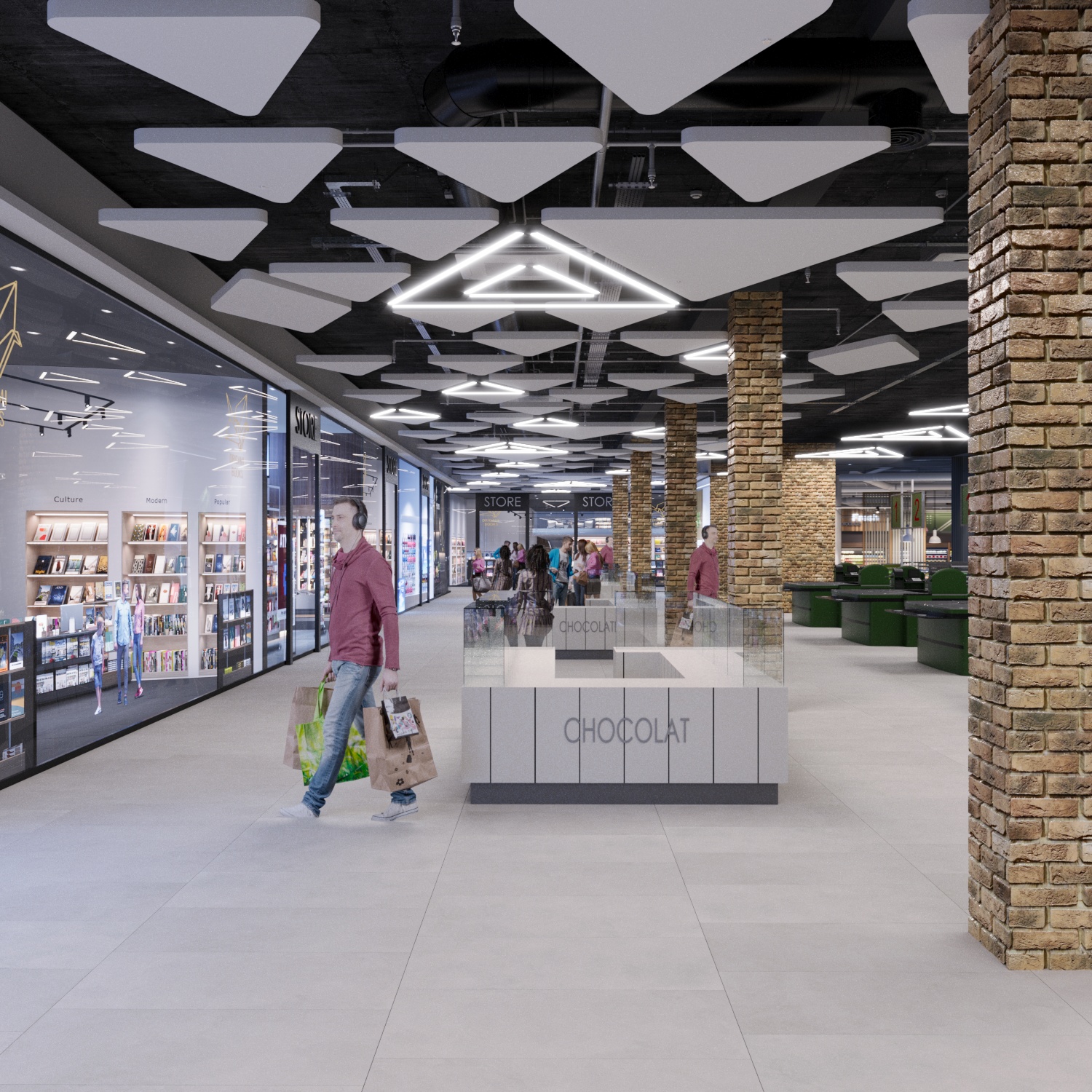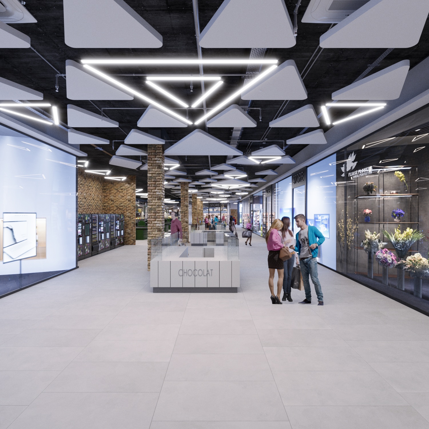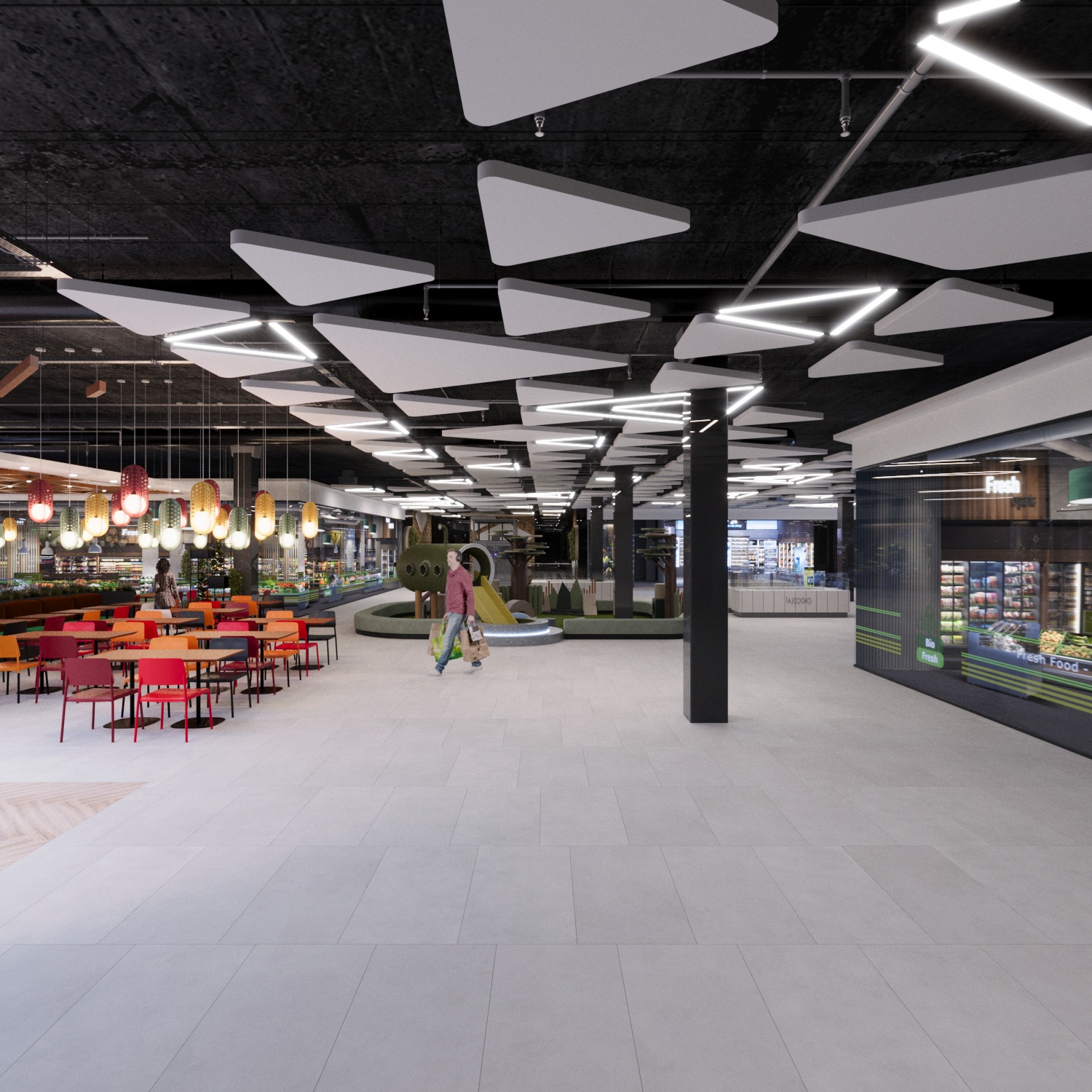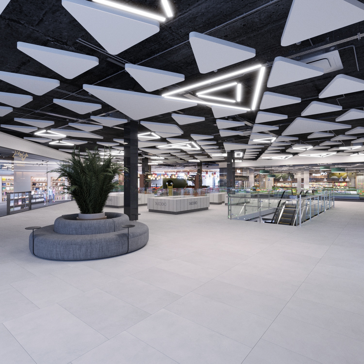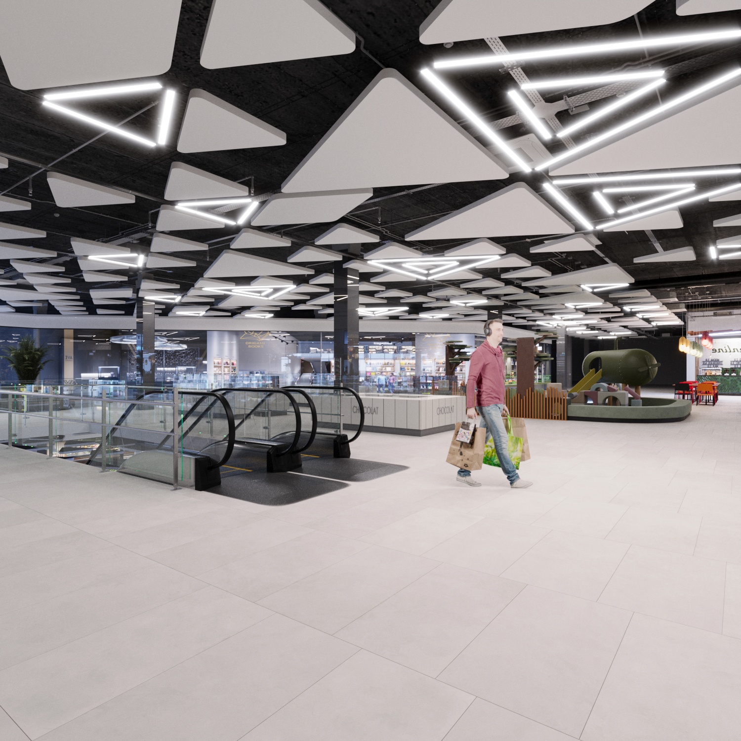 A commercial project that redefines geometry and light. The three-story mall features a unique ceiling made of rounded triangles in two sizes, some filled with triangular light fixtures. The third floor hosts a bright food court and a playful kids’ zone, while light flooring and bold contrasting tiles with vibrant accents set the mood throughout.