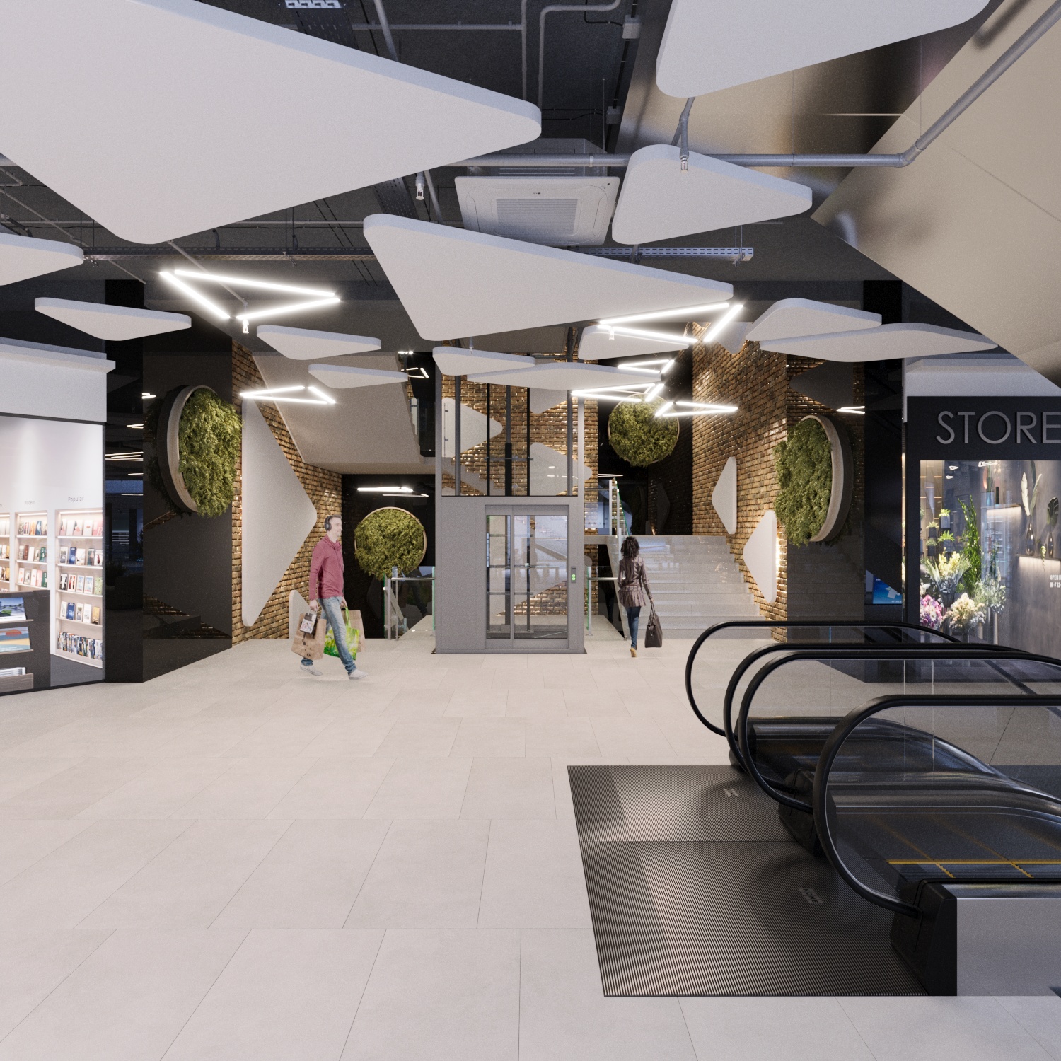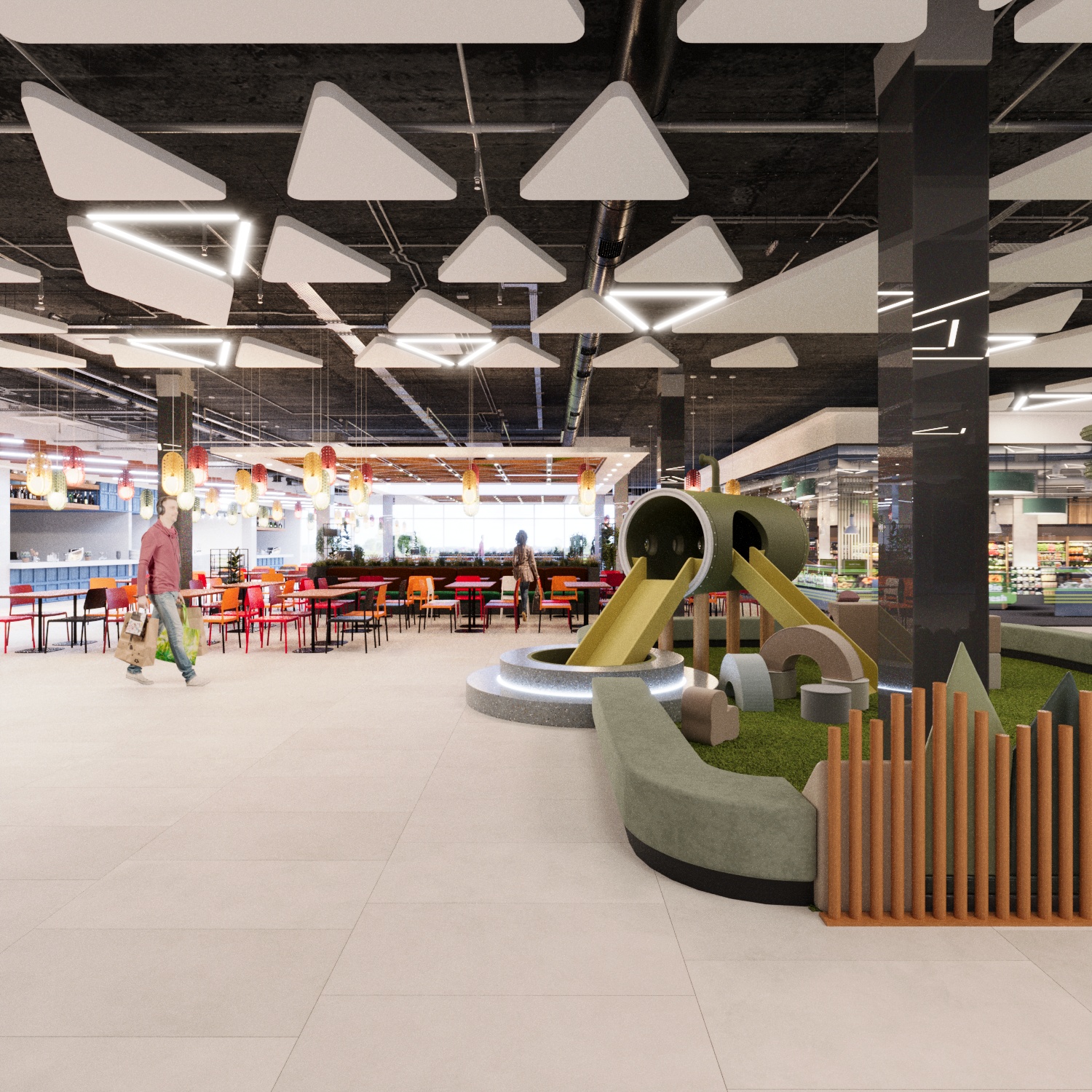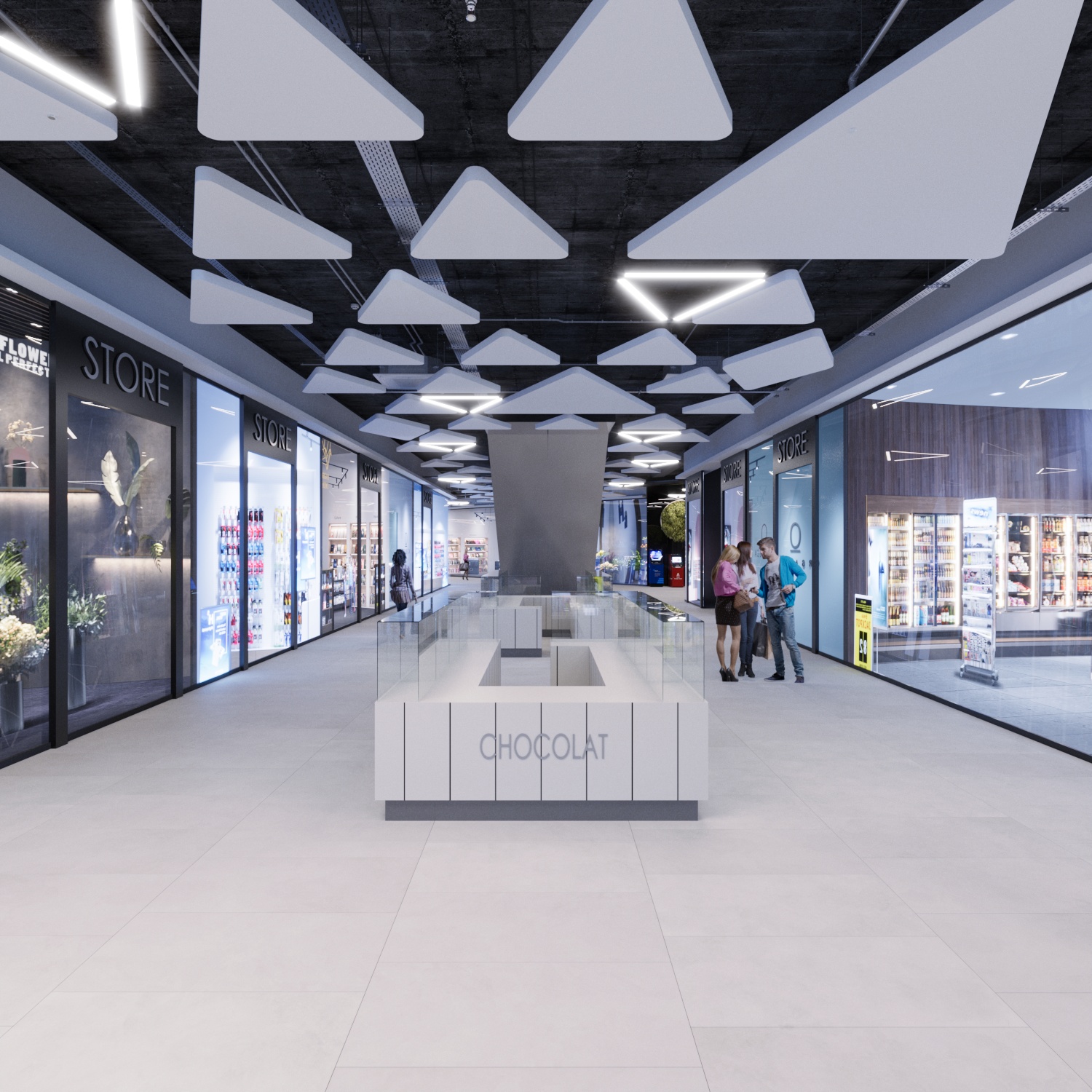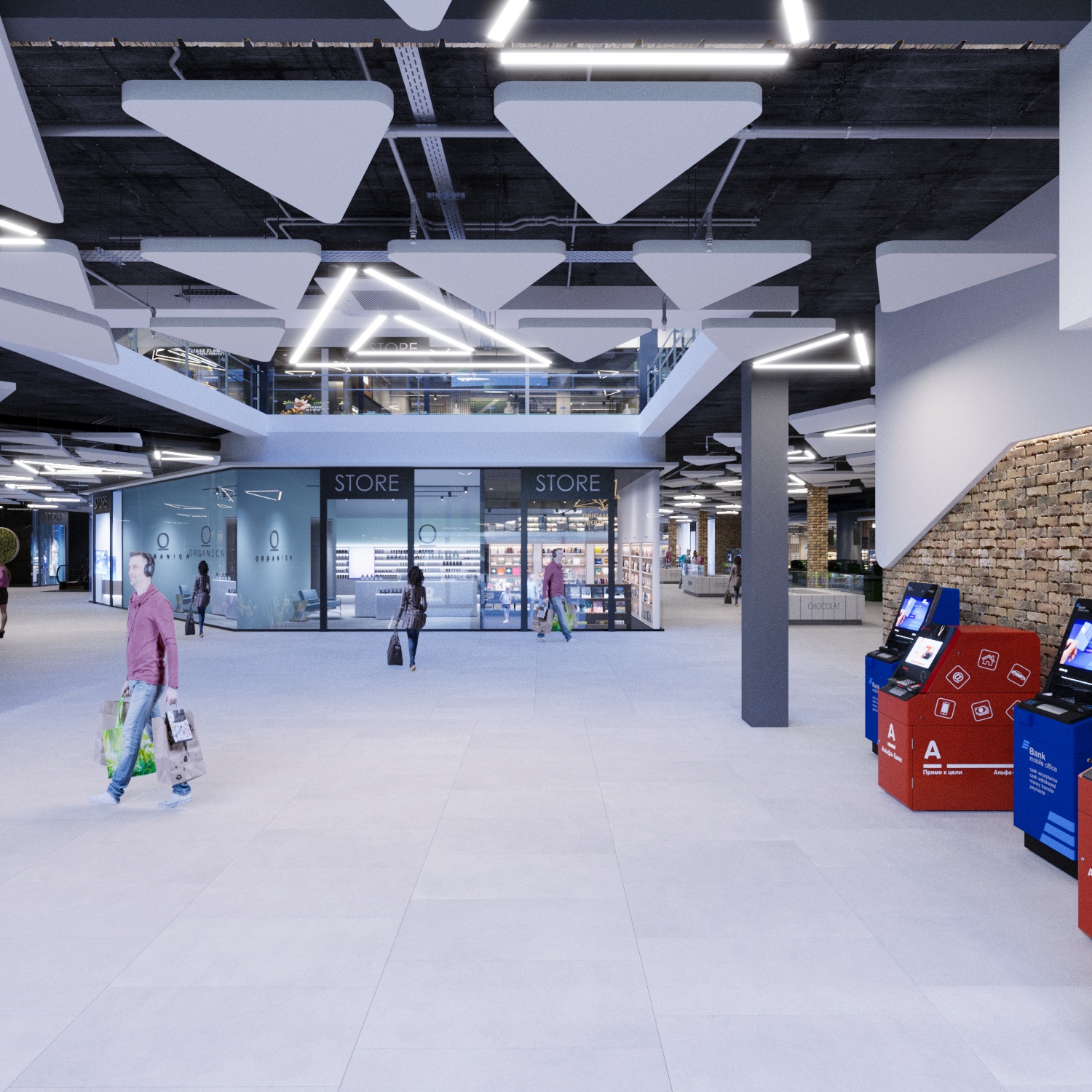 A commercial project that redefines geometry and light. The three-story mall features a unique ceiling made of rounded triangles in two sizes, some filled with triangular light fixtures. The third floor hosts a bright food court and a playful kids’ zone, while light flooring and bold contrasting tiles with vibrant accents set the mood throughout.
