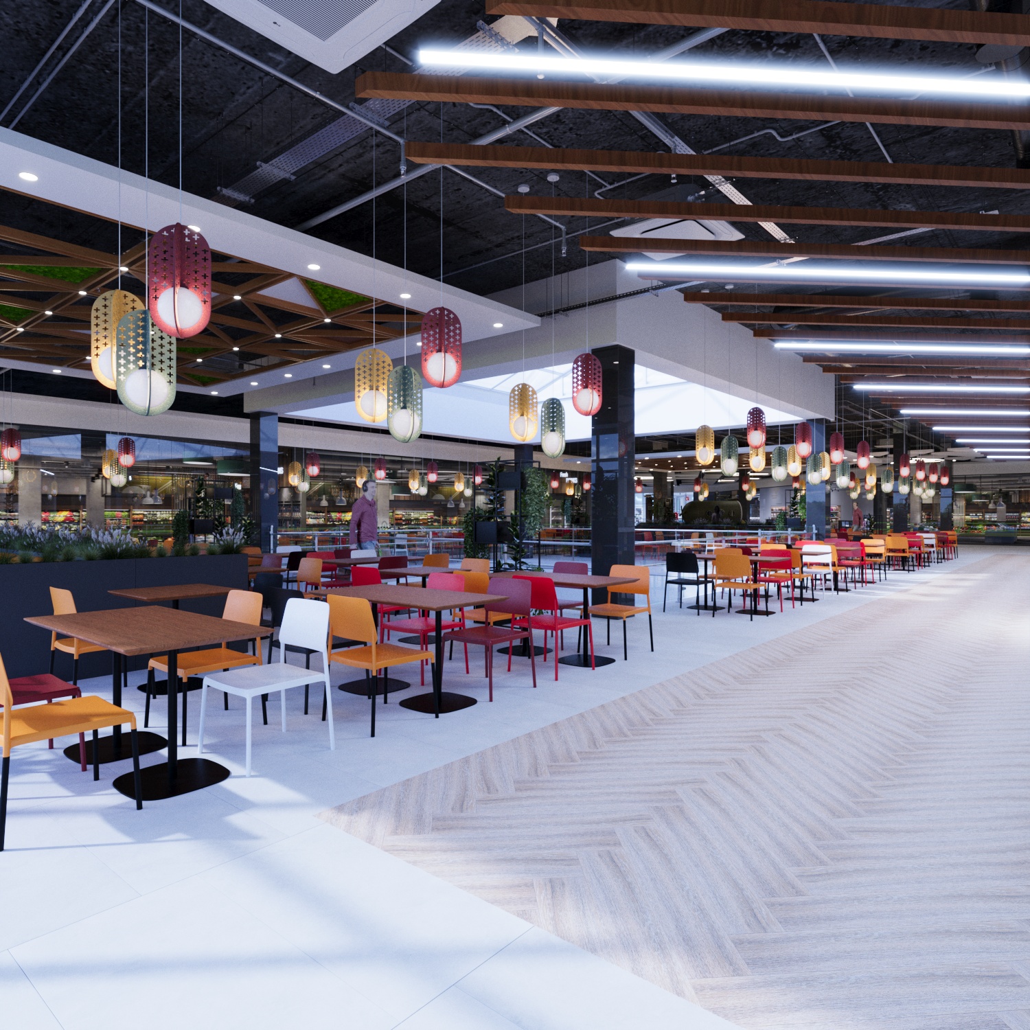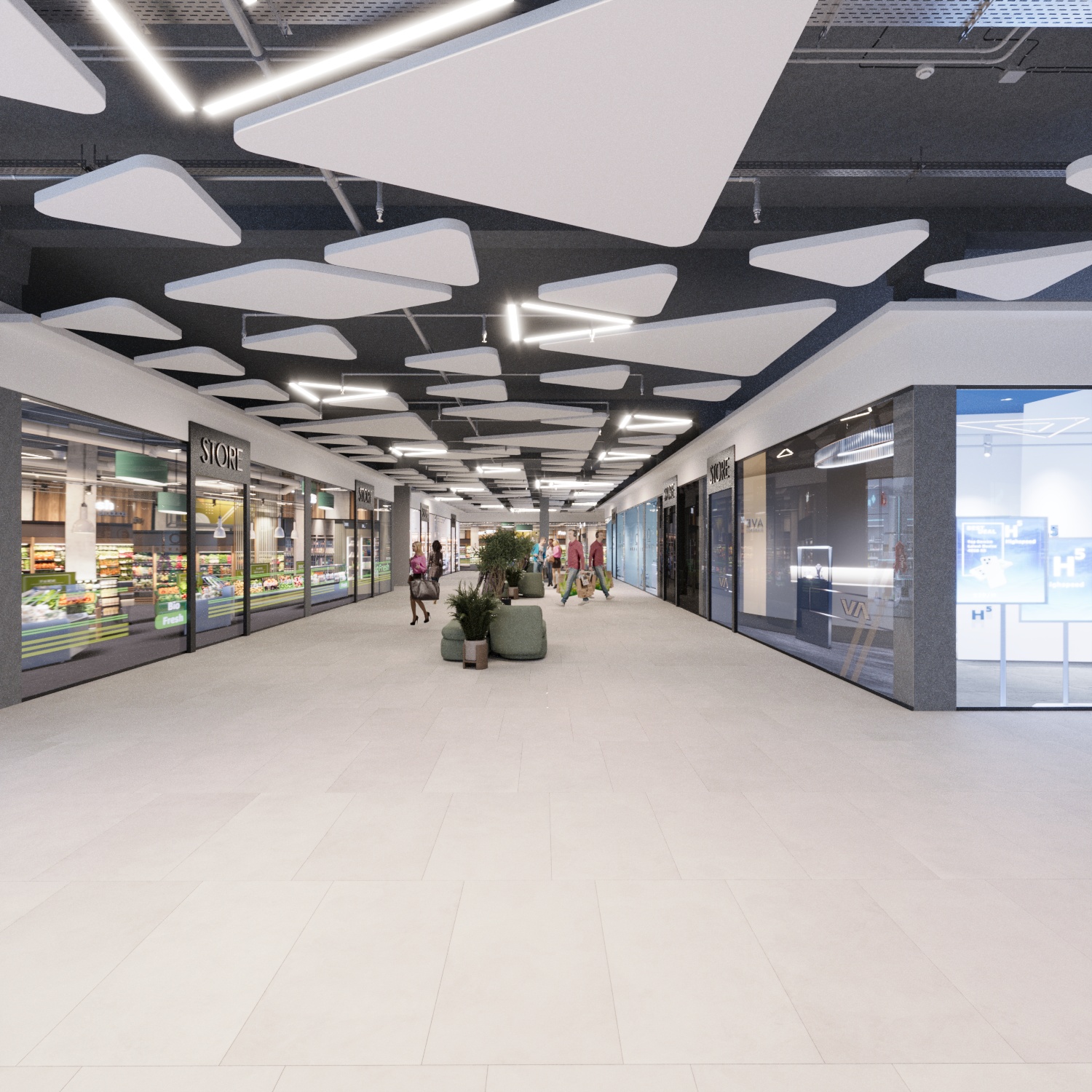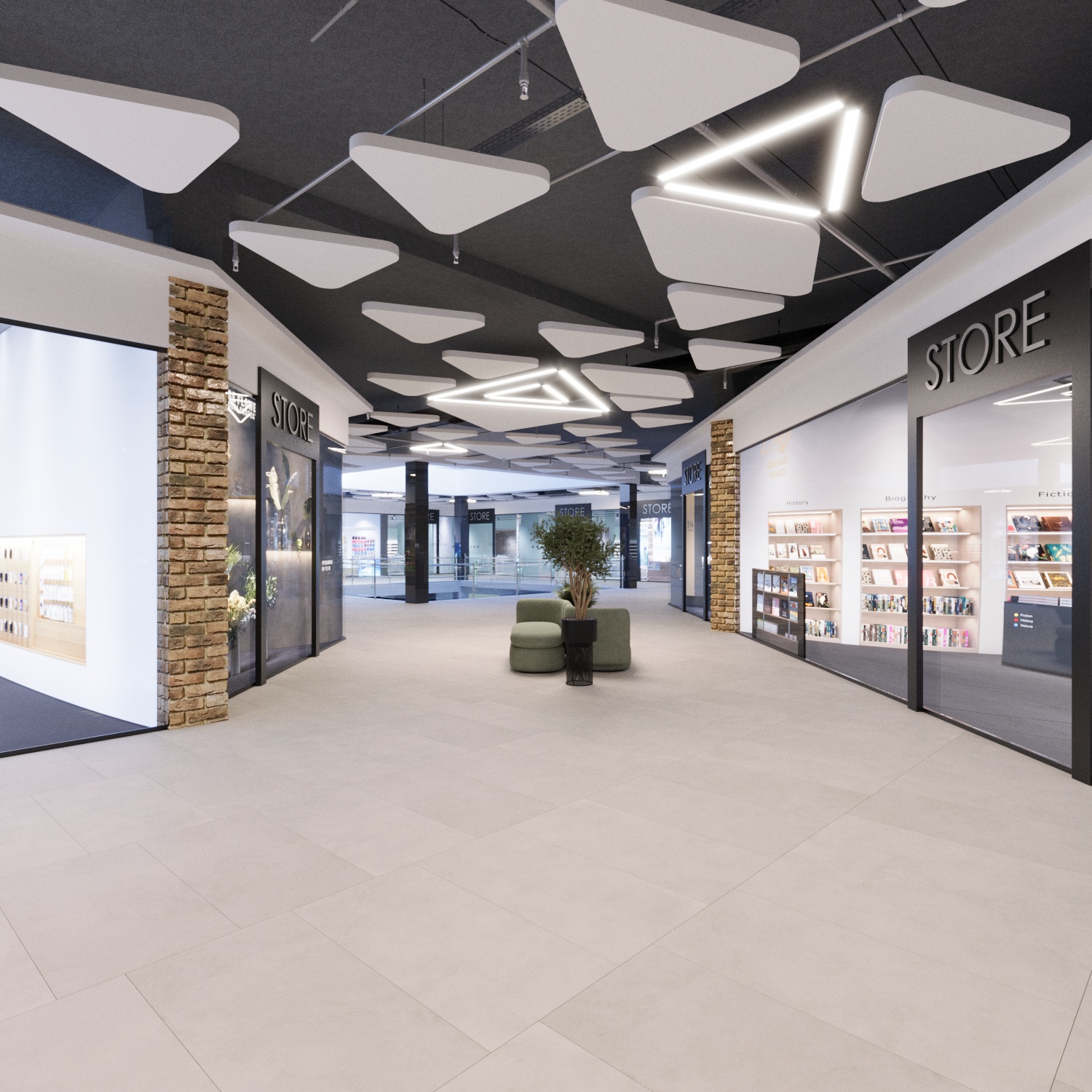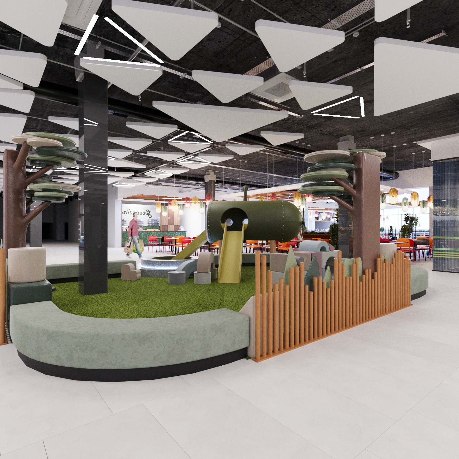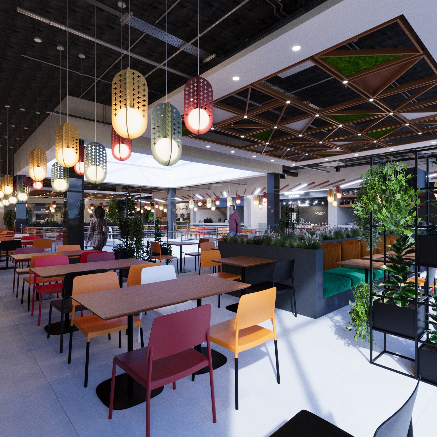 A commercial project that redefines geometry and light. The three-story mall features a unique ceiling made of rounded triangles in two sizes, some filled with triangular light fixtures. The third floor hosts a bright food court and a playful kids’ zone, while light flooring and bold contrasting tiles with vibrant accents set the mood throughout.