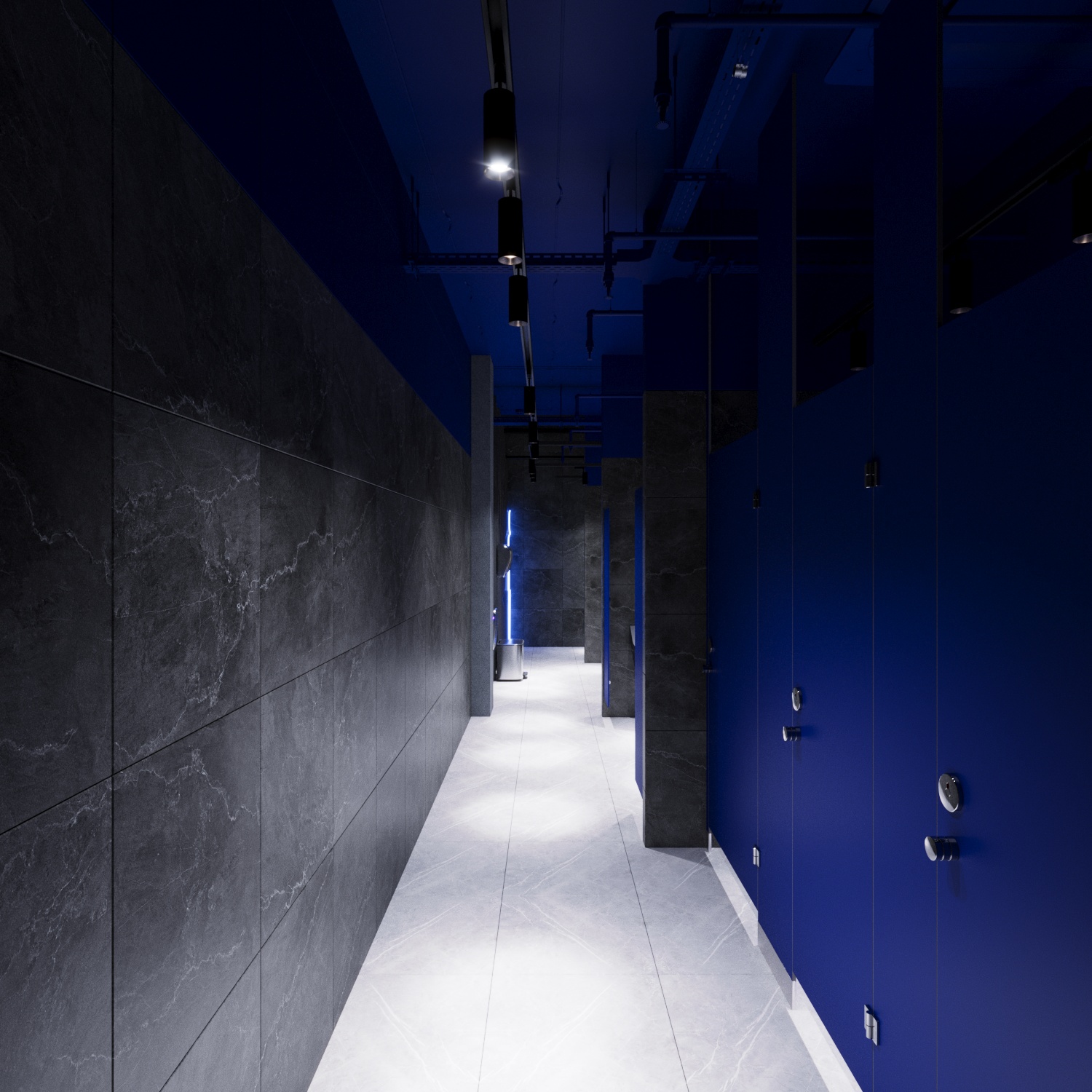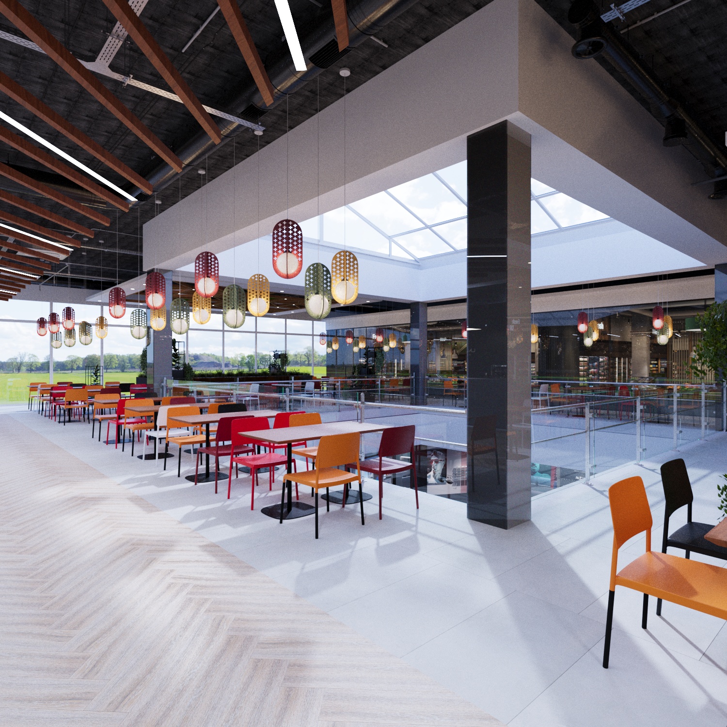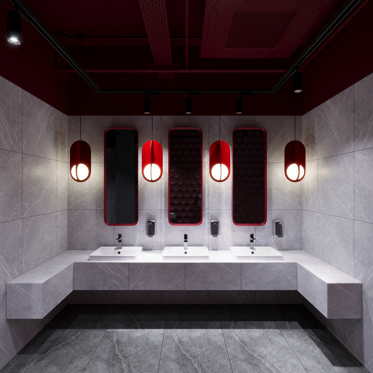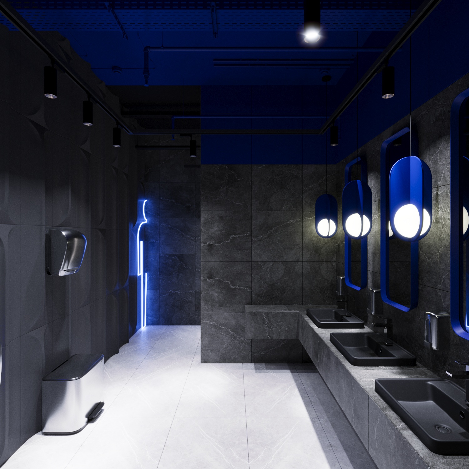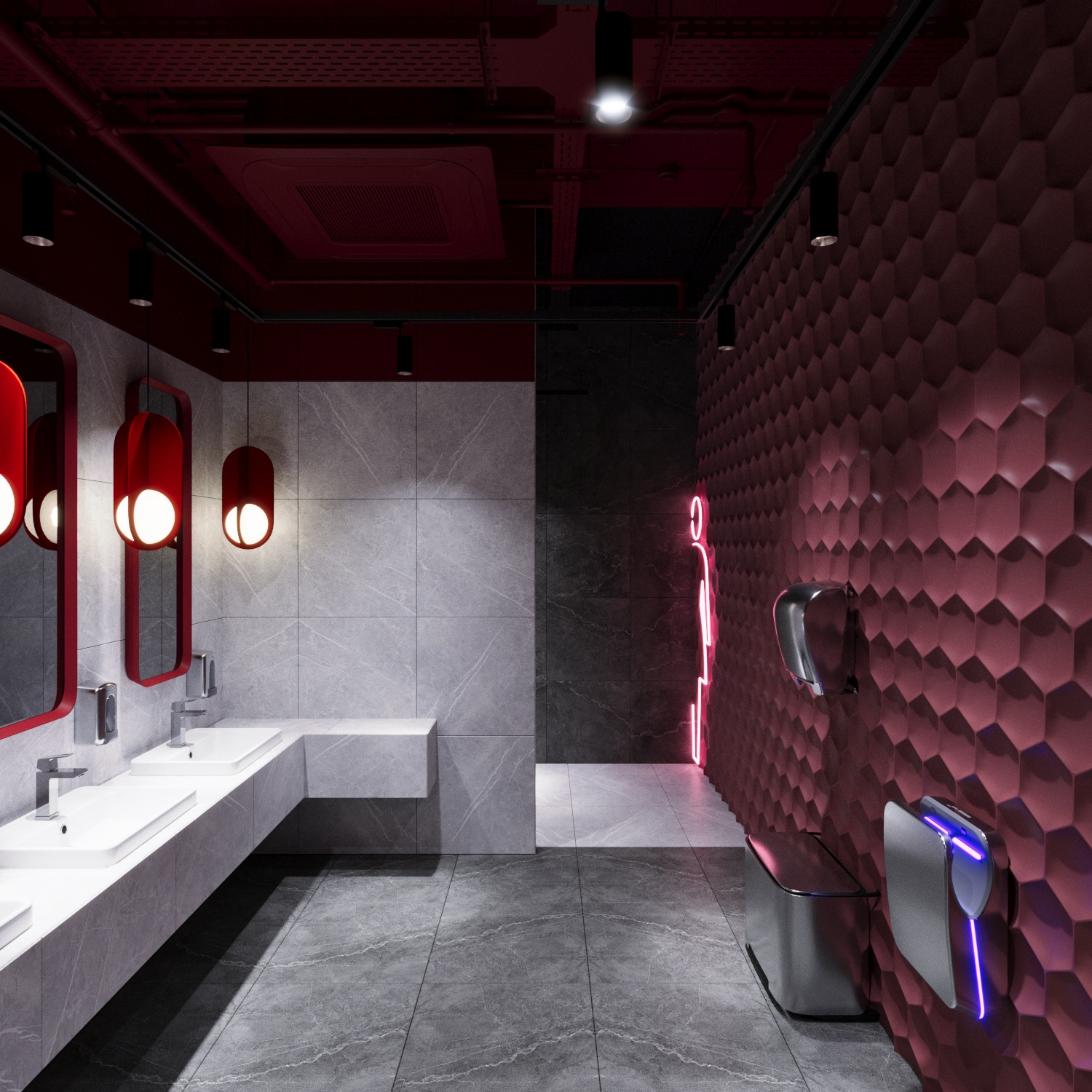 A commercial project that redefines geometry and light. The three-story mall features a unique ceiling made of rounded triangles in two sizes, some filled with triangular light fixtures. The third floor hosts a bright food court and a playful kids’ zone, while light flooring and bold contrasting tiles with vibrant accents set the mood throughout.